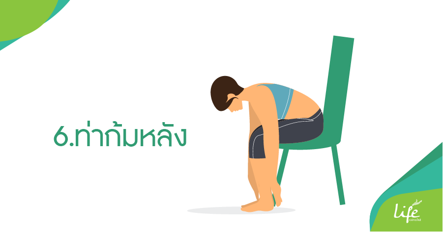 นั่งบนเก้าอี้แล้วกางขาออก ค่อยๆ ก้มตัวลงจนมือทั้ง 2 ข้างแตะพื้น ทำท่านี้ค้างไว้ประมาณ 5 วินาที